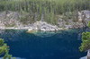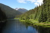 Nous montons jusqu'à Moraine Lake malgré la pluie qui redouble. Nous attendons l'éclaircie pour aller admirer la couleur outremer de ce petit lac glaciaire de 0,5 km2 situé à 1885 m d'altitude. Malheureusement, des travaux nous empêchent d'accéder au plus beau belvédère, le sommet de la moraine (qui a donné son nom au lac).