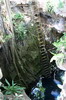 Aujourd'hui, des baignades sont au programme, nous allons visiter 2 cénotes. Pour atteindre le premier, nous empruntons une piste qui nous emmène au coeur de la forêt du Yucatan, une forêt sèche, les arbres sont peu élevés mais la végétation est néanmoins très dense. Nous atteignons le cénote Kankirixche dans lequel nous descendons à l'aide d'une échelle métallique. L'eau est cristalline et révèle une couleur bleue lorsque les yeux sont habités à l'obscurité qui y règne. Les racines des arbres situés au dessus s'infiltrent à travers les fissures du calcaire et pendent au plafond. Quelques chauves-souris et des poissons vivent ici.